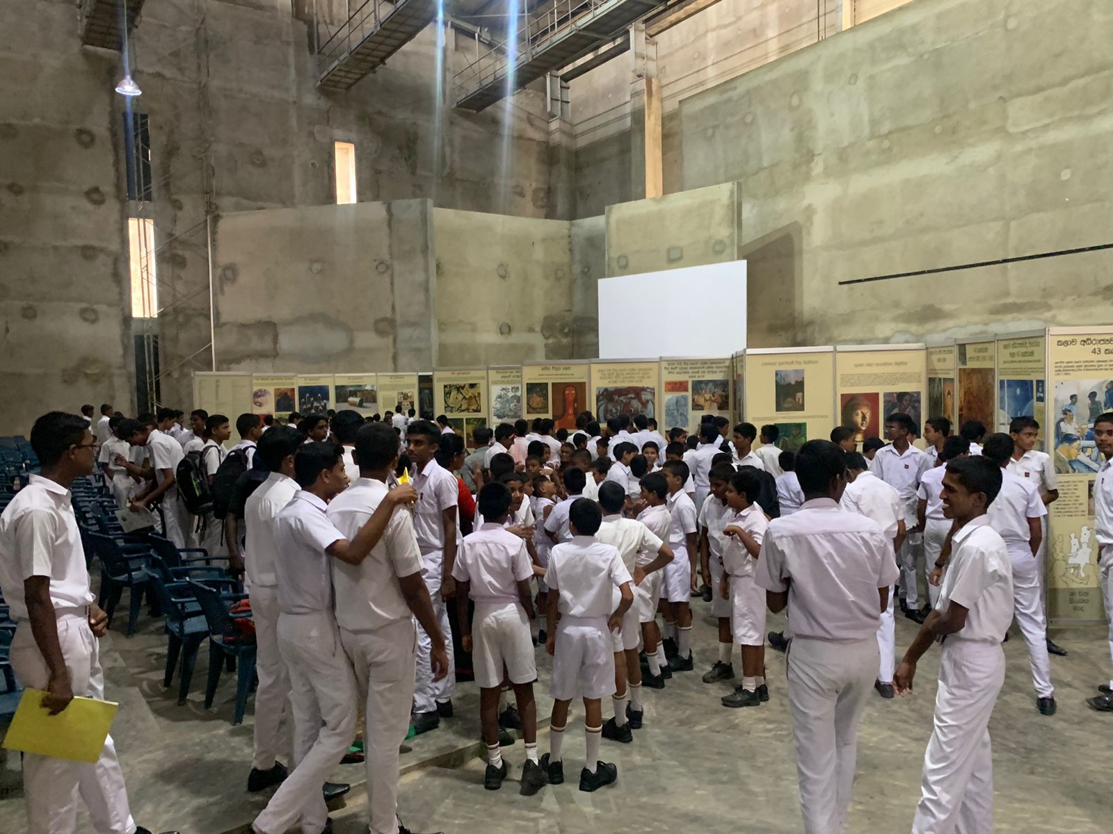 From 15-21 July 2024, Freedom Hub (our parent org.) partnered with the Theertha Artists Collective to host a History of Sri Lankan Art in the 21st Century exhibit at Matara’s Rahula College. Not only did the school’s 500 students attend, but with the support of the Zonal Education Office Matara, so did students from around the district. Whether they were studying science, or arts, or commerce, the students deeply enjoyed seeing this archive of Sri Lankan talent. Our Matara Community artists Hasini, Kethmin and Prabathini,  along with Prof. Jagath, Chanchala and MFA/Theertha artists Anura Krishantha and Bandu Manamperi all served as guides to the student visitors and teachers.